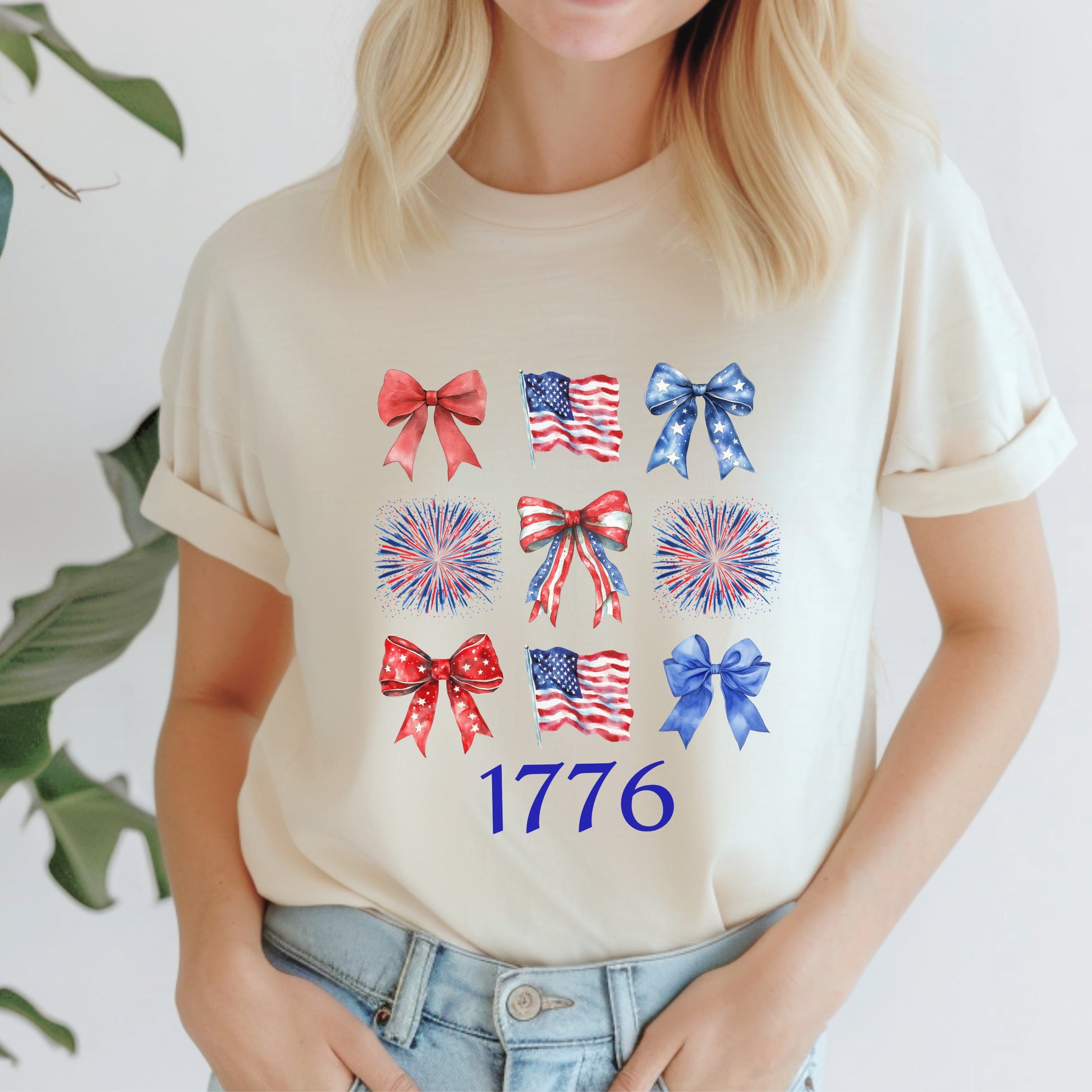 Our Patriotic, Festive, 1776 Independence Day Tee celebrates the USA. Show your American pride with our relaxed style, soft cotton tee. Red, White, Blue, Bows, Fireworks, & Flag patterned design. Wear it to picnics, parties, barbecues, Memorial Day and 4th of July parades! This year is extra special as we celebrate 250 years of Freedom!!