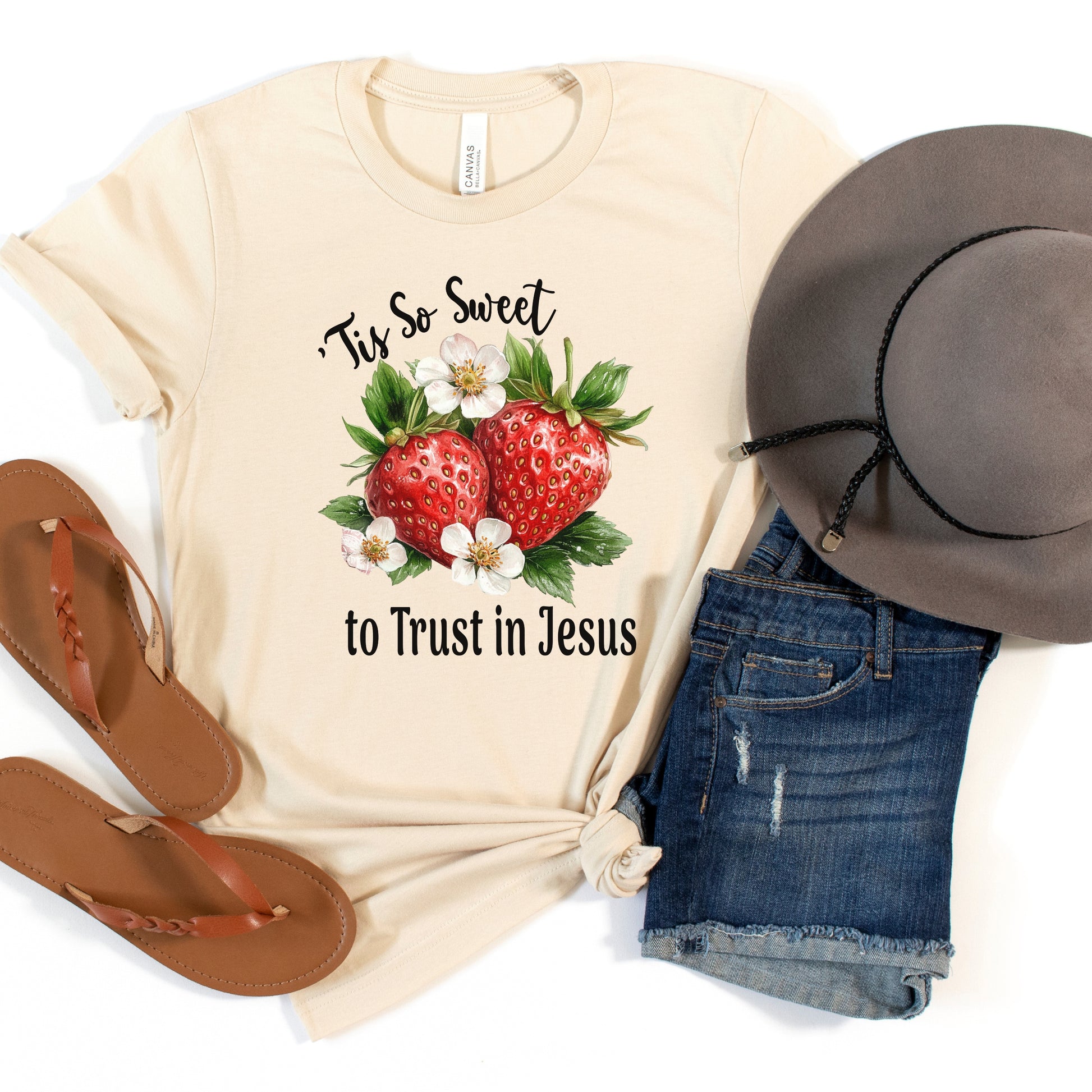 Our soft jersey tee with a colorful strawberry plant design and an encouraging message of how Sweet it is to 'trust in Jesus'. Perfect top for women and teens in any casual setting. Ideal for layering and leisure wear. Colorful design.